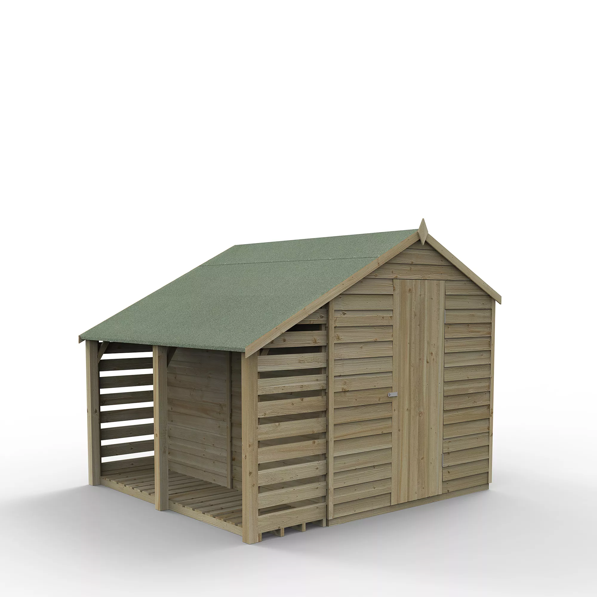 The Forest 4Life Overlap Pressure Treated 8×6 Apex Shed, with Lean To, is strong, and secure. Ideal when you need extra space for storing bulky items like wheelbarrows that benefit from being undercover but don’t need to be inside the shed. It is 6ft deep and provides an integral Lean To that also makes a perfect log store. To suit your garden the Lean To can be constructed either side of your Apex Shed. This wooden shed with lean to comes with an improved design, featuring modular panels. This means it’s delivered in smaller sections but you get more wood, making for an easier assembly, more versatile configuration and a much stronger shed. All in all, the Forest 4Life range of sheds are the best overlap sheds we’ve ever made.